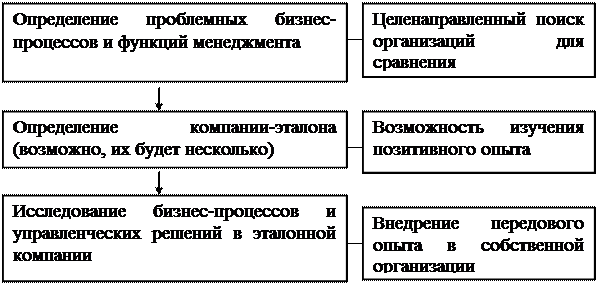 Во-первых, компания должна точно определить наиболее проблемные управленческие функции, чтобы поиск решений по собственному развитию был целенаправленным. Во-вторых, необходимо определить мирового или отечественного лидера, т.е. компанию, в которой данная функция менеджмента выполняется лучше всего. Такой выбор целесообразно делать независимо от отрасли, к которой относится исследуемая организация. В нашей стране сделать это особенно трудно из-за полного отсутствия у менеджеров и консультантов информации о функционировании отечественных фирм-лидеров. В-третьих, группа специалистов организации должна: