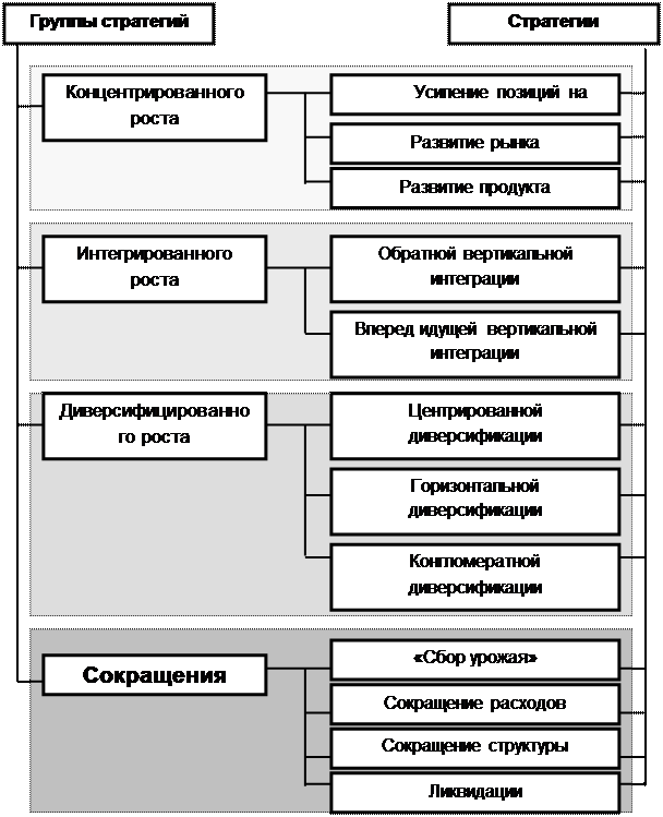 Четвертым типом эталонных стратегий являются стратегиисокращения, которые реализуются в том случае, если предприятие нуждается в перегруппировке сил после длительного периода роста или в связи с необходимостью повышения эффективности при спадах и кардинальных изменениях в экономике. Выделяются четыре типа данных стратегий: