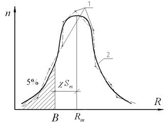 n и R – соответственно количество кубов, имеющих одинаковую прочность, и величина прочности; 1 – опытные значения n и R; 2 – теоретическая кривая, характеризующая разброс прочности с учетом статистической изменчивости (кривая Гаусса)
