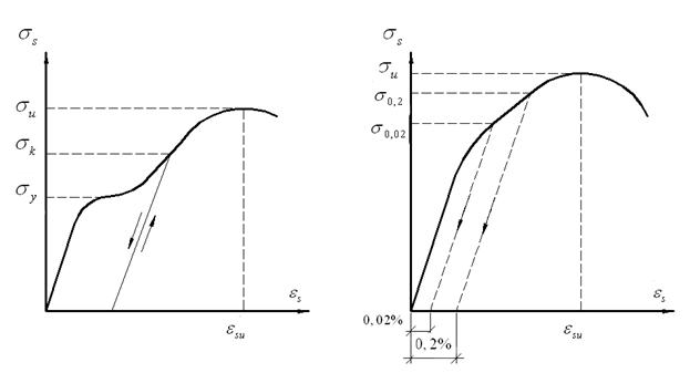 Характеристики прочности и деформативности сталей устанавливают по диаграмме σs – εs, получаемой из испытаний образцов на растяжение. Горячекатаная арматурная сталь, имеющая на диаграмме площадку текучести, обладает значительным удлинением до разрыва (мягкая сталь) (рис. 13, а). Напряжение, при котором деформации развиваются без заметного увеличения нагрузки, называется физическим пределом текучести арматурной стали