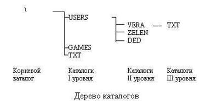 Каталоги (директории, папки) более высоко уровня по отношению к каталогам более низкого уровня являются надкаталогам. Рассмотрим каталог VERA, он является надкаталогом к каталогу ТХТ и подкаталогом к каталогу USERS.