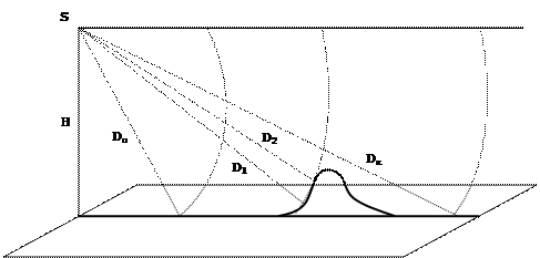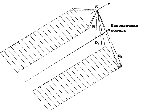 Если расстояния до точек объекта равны между собой (D1 и D2 на рис. 13), то эти разные точки объекта изобразятся в одной точке на снимке. Диапазон измеряемых расстояний и соответственно полоса обзора определяются параметрами съемочной системы и лежат в пределах Do и Dк начальной и конечной измеряемых дальностей.