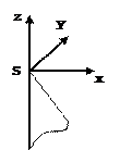 Начало системы координат совпадает с точкой излучения радиоимпульса. Оси y,z лежат в плоскости излучения импульсов. Ось x дополняет систему до правой.