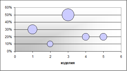 Величина кружка характеризует объем выпускаемой продукции, а ось у доля на рынке. 1, 2…6 – изделия.