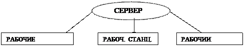 - звездообразнаясеть. В центре центральный узел коммутации – сетевой сервер. Сервер организует передачу сообщений, согласует скорости работы станций и преобразует протоколы обмена, что позволяет соединять разнотипные рабочие станции в рамках одной сети. Здесь очень нагружен центральный узел
