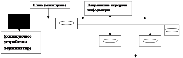 - шиннаятопологиясети – Рабочие станции с помощью сетевых адаптеров подключаются к общей магистрали (шине). Информация поступает на адаптеры всех рабочих станций, но воспринимается адаптером той рабочей станцией, которой адресована. Одновременно передает им информацию одна абонентская система.