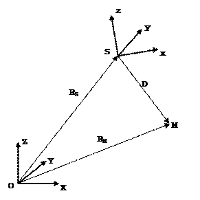 На рис.17 показана точка местности М. Ее положение в системе координат объекта OXYZ определяет вектор RM. Вектор D определяет положение той же точки относительно начала системы координат радиолокационной системы Sxyz. Вектор RS задает начало системы координат радиолокационной системы Sxyz в системе координат объекта.
