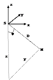 Для определения координат x,y,z в системе координат радиолокационной системы воспользуемся рис.18, из которого следует, что