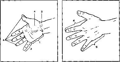 В массаже условно можно выделить пять основных приемов: поглаживание, выжимание, растирание разминание, и вибрацию. Начинается массаж с поглаживания, затем идут - выжимание, растирание, разминание, потряхивание, ударные приемы, движения в суставах и встряхивание. Эта схема условна, и, в зависимости от показаний, может сильно видоизменяться. При описании приемов ручного массажа для указания той или иной части кистей рук, используемой при массаже, пользуются унифицированной терминологией. Эта терминология приведена на (Рис. 1,2).