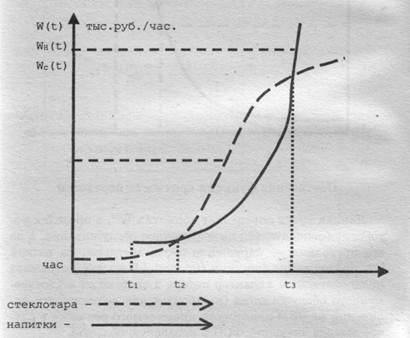 Разная скорость изменения ФСП на разных участках нормативного интервала времени доставки обусловливает возможность регулирования приоритетов различных потребностей. Их соотношение будет зависеть от момента времени, в который осуществляется сравнение. На примере перевозок стеклотары Wc(t) и напитков WH(t) показано, как изменяется во времени соотношение приоритетов разных потребностей, в частности как перевозка более легкого и дешевого груза (стеклотары) получает больший приоритет на участке (t2 — t3) по мере приближения его срока доставки. В момент назначения ездки потребность снижается пропорционально объему отправки, после чего снова возрастает в ходе производства и потребления и т.д. На рис. показано возможное перераспределение приоритетов перевозок тех же двух грузов с учетом их снижения в моменты назначения ездок.