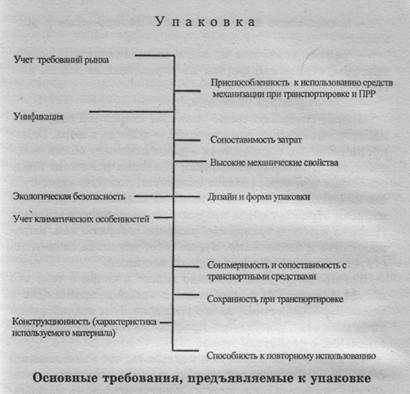 Упаковка, представляя товар, предохраняя его от повреждений, способствуя результативности процесса товародвижения, преломляет в себе множество параметров, обеспечивающих эффективность продаж товара. Наглядно перечень требований предъявляемых к упаковке представлен на схеме.