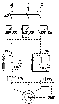 Контакторы КВ и КН, как и в схеме рис.5.6, коммутируются при отсутствии тока в силовой сети и только потом контактором КУ подается сигнал на включение КТ1 и КТ2