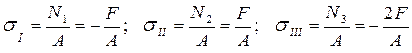 Для примера, показанного на рис. 4.4, напряжения по участкам I, II и III будут равны: