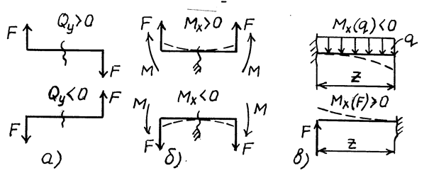 Определение знака поперечной силы по рис. 6.4,а в уравнениях обычно не вызывает затруднений. Для определения знака изгибающего момента надо представить, что балка защемлена (рис. 6.4.,в) в том сечении, где определяется