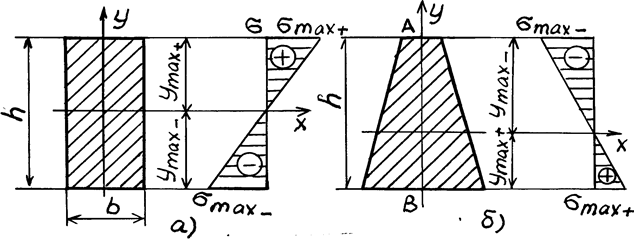 ). Поэтому для таких балок применяют сечения несимметричные относительно нейтрального слоя (рис. 46,б). В таком случае необходимо нагружать балку так, чтобы