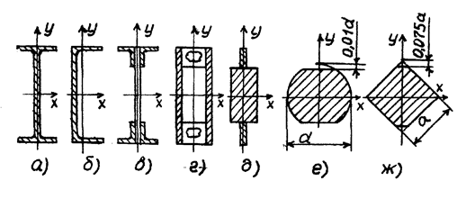 Стремление к рациональному использованию материала балок, привело к созданию прокатных профилей в виде двутавров, швеллеров (рис. 8.7,а,б), клепанных (сварных) металлических и клееных деревянных балок (рис. 8.7,в,г).