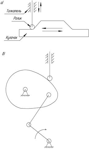 а) плоские (кулачок и толкатель перемещаются в параллельных плоскостях) (рис. 9.5 а);