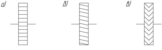 Шевронными называются колеса, у которых зубчатый венец образуется из двух рядов косых зубьев противоположного направления (рис. 9.10 в).