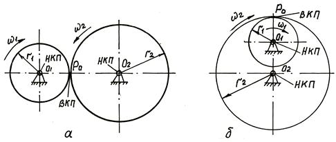 Зубчатый механизм может быть с внешним (рис. 11. 1. а) и внутренним (рис. 11. 1. б) зацеплением. Точка Р 0 представляет собой мгновенный центр вращения в относительном движении зубчатых колес. Радиусы r 1 и r 2 являются радиусами окружностей, перекатывающихся друг по другу без скольжения и называющихся центроидами или начальными окружностями. Как видно из рис. 11.1, при внешнем зацеплении колеса вращаются в противоположные стороны, а при внутреннем зацеплении – в одну сторону.