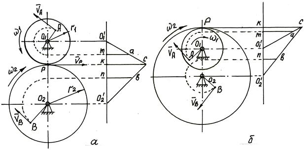 Пусть окружности с радиусами r1 и r2, соприкасаясь в точке Р, перека-тываются без скольжения друг по другу с угловыми скоростями ω1 и ω2 (рис. 11.1).