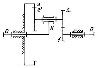 В этом случае водило становится как бы неподвижным и планетарный механизм превращается в обычный механизм с неподвижными осями вращения колес 1,2,2' и 3. Такой механизм называется обращенным. Его передаточное отношение равно: