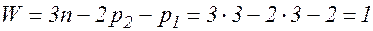 Определим степень подвижности планетарного механизма (рис.11.3), имеющего три подвижных звена, три низших кинематических пар и две высших кинематических пар, т.е. n=3, p2=3, p1=2: