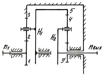 Вращаясь, колесо 1 вращает сателлит 2, который перекатываясь по неподвижному колесу 3, заставляет вращаться водило Н, а следовательно, и связанное с ним колесо 5. Колесо 5 вращает сателлит 4, который, перекатываясь по неподвижному колесу 3', заставляет вращаться водило Н2 и, следовательно, выходной вал.