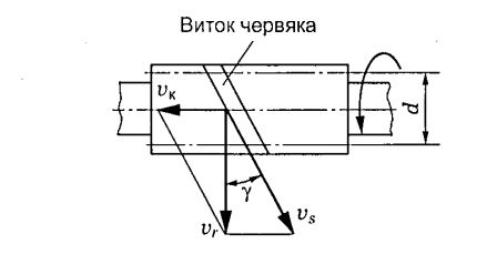 Рис.15.5. Скольжение в передаче: vk – линейная скорость витка колеса; vr – линейная скорость витка червяка; vs – скорость взаимного скольжения.