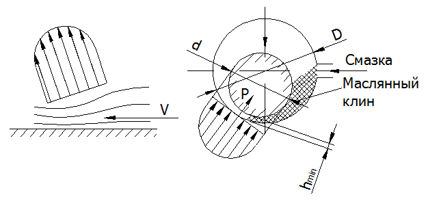 Полужидкостное трение имеет место при неустановившемся режиме (трогании с места, торможении, резких толчках и ударах). Основы теории смазки при жидкостном трении впервые разработаны русским ученым проф. Петровым. Он установил, что поток движущейся жидкости, взаимодействуя о наклонной пластиной, образует масляный клин и создает подъемную силу, величина которой пропорциональна скорости и вязкости жидкости и обратно пропорциональна квадрату минимального зазора. В подшипнике, при смещении вала под действием нагрузки на величину эксцентриситета, также образуется изогнутые масляный клин и возникает подъемная сила, которая при жидкостном трении уравновешивает реакцию опоры, и вал вращается, не касаясь подшипников.
