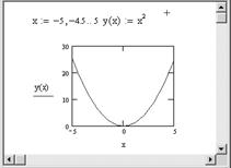 · установить курсор в то место, где должен быть построен график, на математической панели выбрать кнопку Graph (график) и в открывшейся панели кнопку X-Y Plot (двухмерный график);