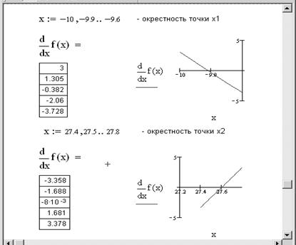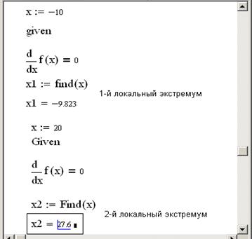 Определим по графику начальные приближения значений х, соответствующих локальным экстремумам функции f (x). Найдем эти экстремумы, решив уравнение