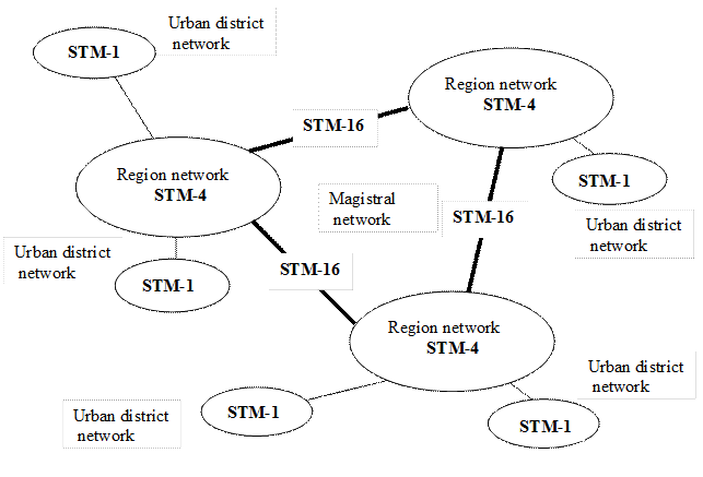 Иерархия SDH включает в себя несколько уровней STM. В качестве примера использования уровней в сети SDH на рис.1 показана первичная сеть SDH, включающая кольца магистральной сети, построенной на потоках STM-16, региональных сетей, построенных на потоках STM-4,и локальных сетей с потоками STM-1.