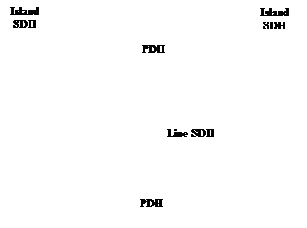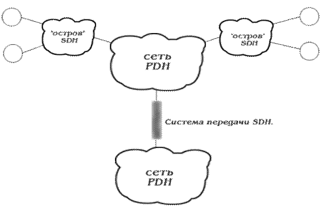В процессе внедрения технологии SDH на первом этапе вероятно появление комбинированных сетей SDH/PDH. Технология SDH внедряется обычно в виде "островов", объединенных каналами существующей первичной сети (рис. 2). На втором этапе "острова" объединяются в первичную сеть на основе SDH. В результате на современном этапе необходимо не только рассматривать технологию SDH, но и ориентироваться на изучение комбинированных сетей и процессов взаимодействия SDH и PDH.