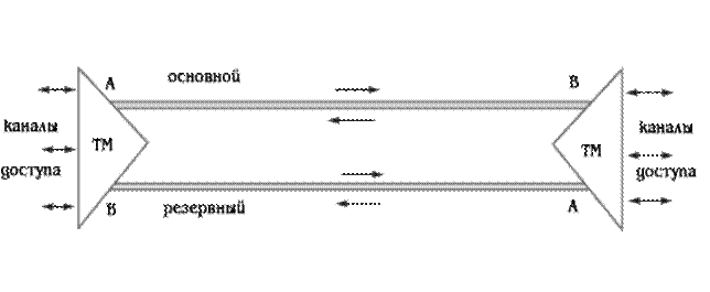 Сегмент сети, связывающий два узла A и B, или топология "точка - точка", является наиболее простым примером базовой топологии SDH сети (рис.8.). Она может быть реализована с помощью терминальных мультиплексоров ТМ, как по схеме без резирвирования канала приёма/передачи, так и по схеме со стопроцентным резервированием типа 1+1, использующей основной и резервный электрические или оптические агрегатные выходы (каналы приёма/передачи).