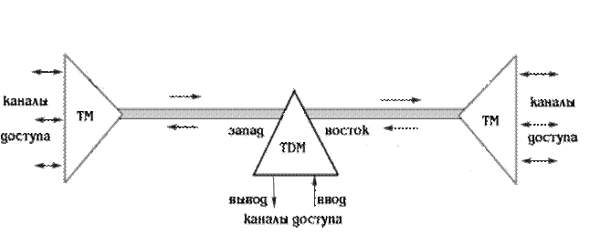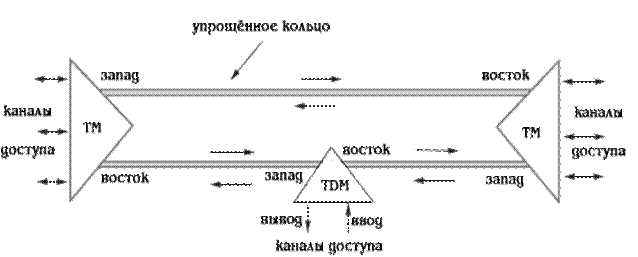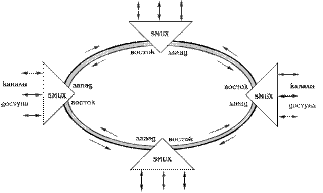 Эта топология (рис.12.) широко используется для построения SDH сетей первых двух уровней SDH иерархии (155 и 622 Мбит/с). Основное приемущество этой топологии - лёгкость организации защиты типа 1+1, благодаря наличию в синхронных мультиплексорах SMUX двух пар оптических каналов приёма/передачи: восток - запад, дающих возможность формирования двойного кольца со встречными потоками.