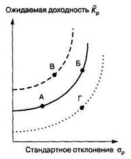 Если объединить в портфель некоторое число ценных бумаг, корреляция доходности которых лежит в диапазоне от -1 до +1, то в зависимости от их удельных весов можно построить множество портфелей с различными параметрами риска и доходности, которые расположатся в рамках фигуры АБВГ на рис 21.4.