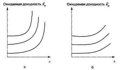 В первом случае (а) малое увеличение риска инвестор готов допустить лишь с компенсацией в виде значительного увеличения доходности. Во втором случае (б) инвестор ради небольшого увеличения Доходности готов принять значительное увеличение риска.
