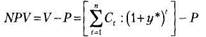 Так как цена покупки облигации — это ее рыночный курс (Р), то для менеджера чистая приведенная стоимость (NPV) равняется разности между стоимостью облигации и ценой покупки: