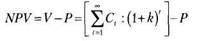 Для удобства расчетов текущий момент времени принимается за ноль, т.е. t = 0. Тогда если затраты на приобретение актива в момент времени t = 0 составляют Р, то его чистая приведенная стоимость (NPV) равна разности между внутренней стоимостью актива и затратами на приобретение.