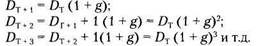 Третье предположение описывается с помощью модели переменного роста. Главная особенность этой модели в периоде времени в будущем (7), после которого ожидается, что дивиденды будут расти с постоянным темпом (g). При этом необходимо составить прогноз дивидендов до периода Т исходя из индивидуального прогноза по величине дивидендов (Д, Д, D3... Д) для каждого подпериода, а также спрогнозировать наступление момента Т. После наступления момента времени Т дивиденды будут расти следующим образом: