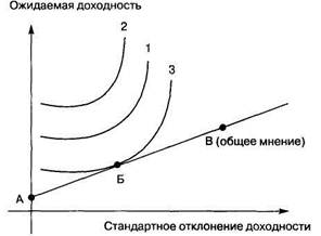 Менеджер формирует портфель, в котором сочетание безрисковых ценных бумаг и индексного фонда схоже с рыночным портфелем (общее мнение). Точка А показывает доходность с нулевым риском, которую обеспечивают безрисковые ценные бумаги. Точка В — риск и ожидаемую доходность среднерыночного портфеля, которые соответствуют общему мнению на рынке. Линия, идущая через точки А и В, представляет собой сочетание двух типов инвестиций. Кривые безразличия (1, 2,3) показывают отношение инвестора, для которого менеджер формирует портфель, к риску и доходности. Точка Б, в которой кривая безразличия является касательной к линии АВ, представляет собой оптимальное сочетание доходности и риска.