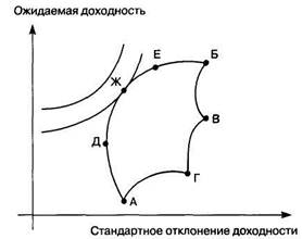 Менеджеру следует инвестировать в те ценные бумаги, которые формируют оптимальный портфель инвестора, т.е. портфель, соответствующий точке, в которой кривая безразличия является касательной к эффективному множеству (это точка Ж).