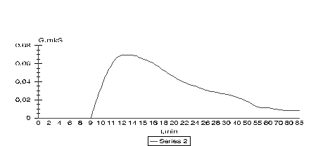 Результаты мониторинга диэлектрических характеристик (проводимость G[мкСм]=Сwtgd в процессе отверждения реактопласта (эпоксидная смола). Первый максимум - заполнение формы (удаление воздуха), второй максимум - переход из вязко-текучего в твердое состояние.
