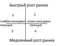 Выбор страт-ии м/о производить исп-я матрицу Томпсона и Стрикленда, на осях которой представлены динамика роста рынка продукции и конкурентная позиция предприятия.