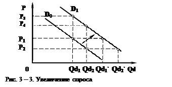 Увеличение спроса означает, что при любой из возможных цен потребители (покупатели) могут и готовы купить больше товара или купить те же количества товара по более высоким ценам. На графике увеличение спроса приводит к сдвигу кривой спроса вправо от D0 к D1 (рис. 3-3). Например, товар стал модным, и поэтому потребители теперь могут и готовы купить по цене P1 не количество Qd1, а большее количество Qd1 ` или купить прежнее количество Qd1 по более высокой цене P3. А при цене P2 потребители могут и готовы купить не количество Qd2, а большее количество Qd2` или купить прежнее количество товара Qd2 по более высокой цене P4.