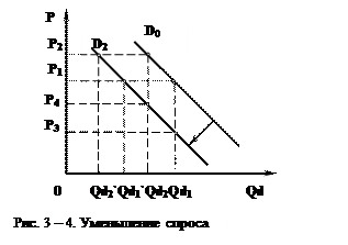 кой (низкой) цене. Изменение спроса на графике выражается в виде сдвига кривой спроса: при увеличении спроса - вправо, от D0 к D1 (рис. 3-3), а при уменьшении спроса - влево, от D0 к D2 (рис. 3-4).