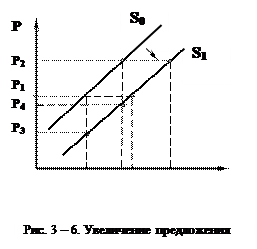 Изменение предложения под действием неценовых факторов приводит к сдвигу кривой предложения. Увеличение предложения приводит к сдвигу вправо кривой предложения от S0 к S1 (рис. 3-6), а уменьшение предложения - к сдвигу кривой предложения влево от S0 к S2 (рис.3-7).