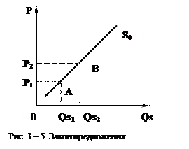 Если величина спроса находится в обратной зависимости от цены товара, то между ценой и величиной предложения существует прямая зависимость: если цена растет, то при прочих равных условиях на рынок поступит больше данного товара, так как производителю выгодно увеличить его производство, и наоборот. Закон предложения выражает прямую взаимосвязь между ценой и величиной предложения товара (рис.3-5).