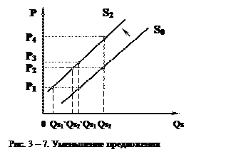Теперь (рис. 3-7) при цене Р1 производители (продавцы) могут и готовы поставить на рынок не Qs1 единиц товара, а меньшее количество Qs1` или могут и готовы поставить прежнее количество товара Qs1 по более высокой цене P3. А при цене P2 производители (продавцы) могут и готовы поставить меньшее количество продукции Qs2`, а не Qs2 или могут и готовы поставить прежнее количество товара Qs2 по более высокой цене P4.
