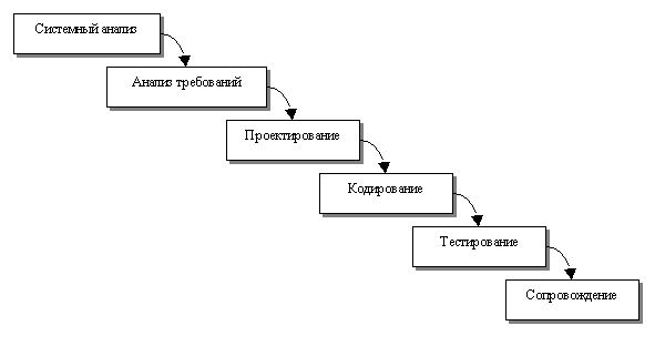 В каскадной модели переход на следующий, иерархически нижний этап происходит только после полного завершения работ на текущем этапе (рис. 10).